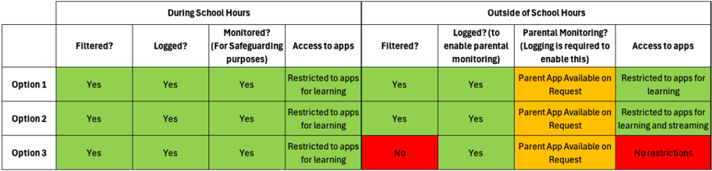 Option 2) JAMF extends to 24 hours a day, but allows a wider range of selected apps, including entertainment apps, outside of the school day. Social media and messaging apps are not available. JAMF continues to provide internet filtering.