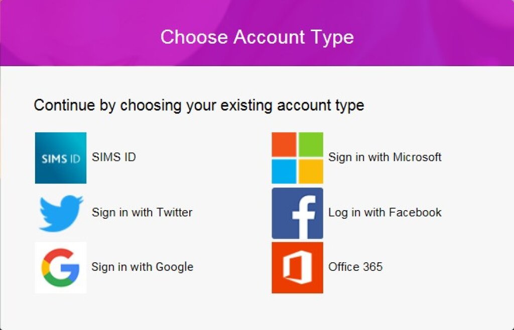 1. You should register with a Microsoft, Office 365, Google, Facebook or Twitter account. Click the icon for the relevant Third Party account and you will be directed to sign in using your existing details. If you try to enter your Third Party details in the SIMS ID Username and Password fields, an error will be displayed.
