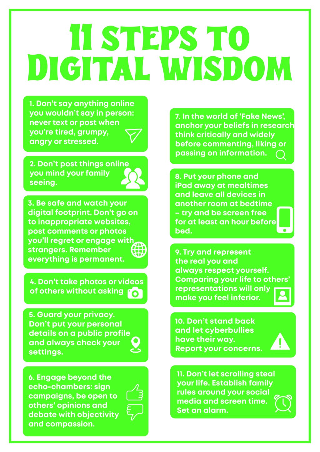 Talk to your child about protecting their privacy, how to be safe online and to be mindful of fake news.  Use the 11 Steps To Digital Wisdom for guidance if needed.