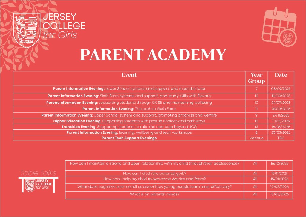 We look forward to welcoming you to many of these events in the coming months and years. If there is a topic for discussion or a forum for engagement that you think would enhance the Parent Academy, please share your suggestions with Simon Milner, Assistant Headteacher, (Student Guidance), at s.milner@jcg.sch.je