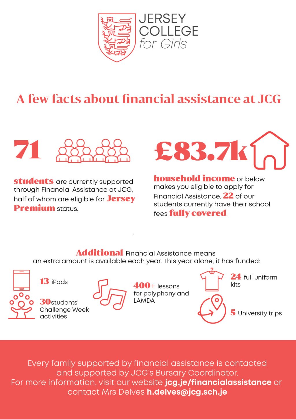 Financial Assistance is primarily aimed at families with a total household income of under £83,682. Please contact h.delves@jcg.sch.je if you have any queries.